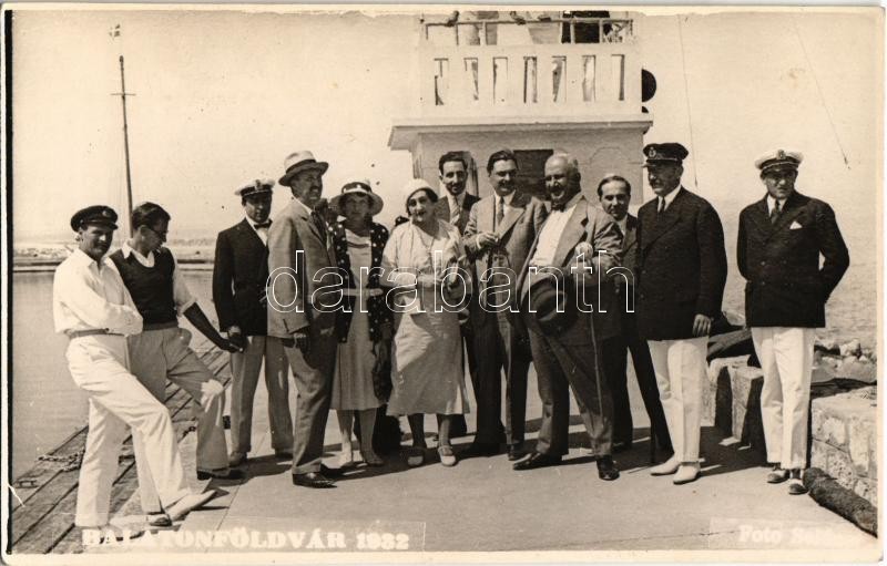 Leírás: 1932 Balatonföldvár, hajókapitányok és utasok a mólón. Foto Seidner photo