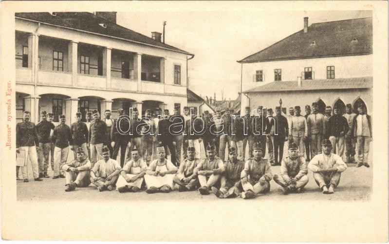Leírás: Eger, laktanya, katonák. Baross nyomda