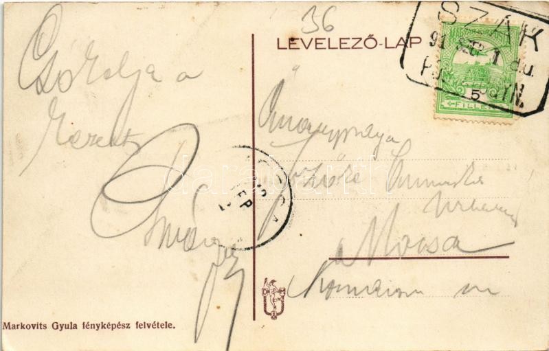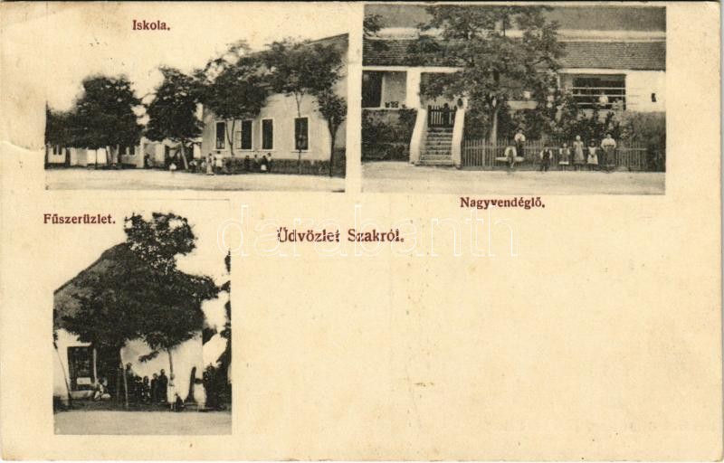 Leírás: Szák, Szákszend; iskola, nagyvendéglő, fűszer üzlet. Markovits Gyula fényképész kiadása + "SZÁK POSTAI ÜGYN"