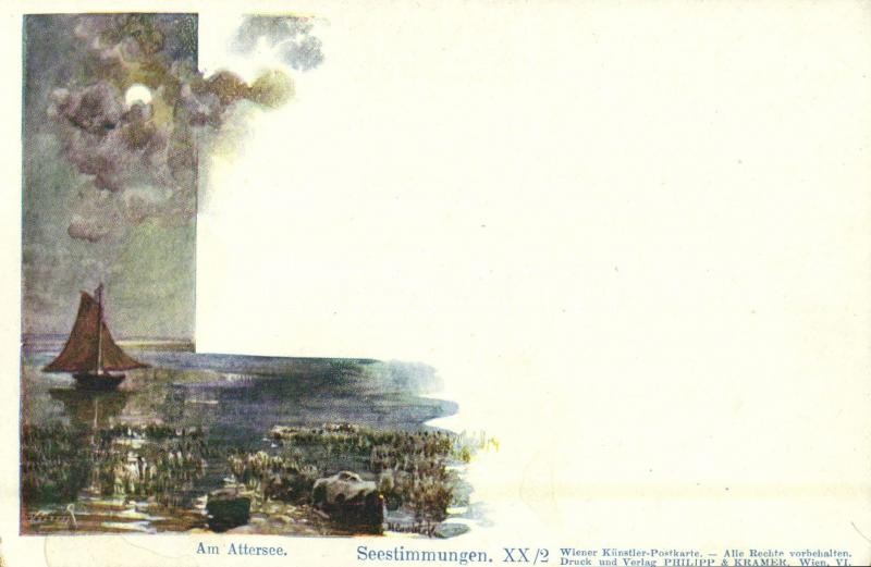 Leírás: Am Attersee, Seestimmungen, Wiener Künstler-Postkarte, Druck und Verlag Philipp & Kramer / lake s: Vilim