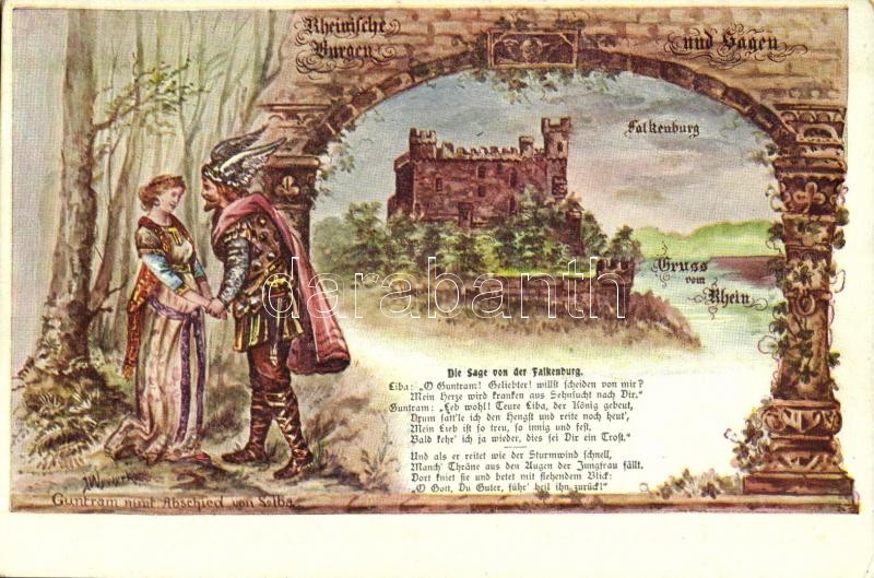 Leírás: Falkenburg, Guntram nimmt Abschied von Liba; Rheinische Burgen und Sagen, Josef Wewerka / knight, lady, castle, Art Nouveau s: Wewerka