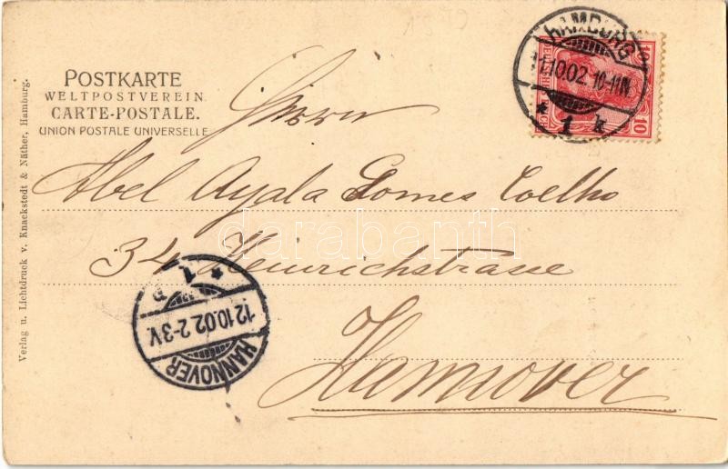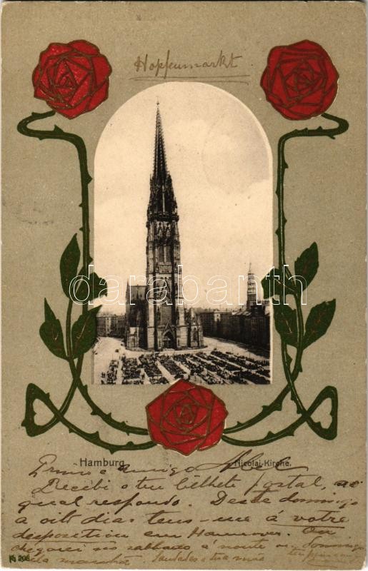 Leírás: 1902 Hamburg, Nicolai-Kirche / church, market. Verlag u. Lichtdruck v. Knackstedt & Näther. Art Nouveau, floral, litho frame