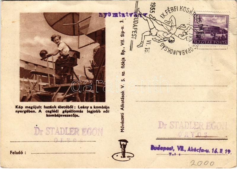 Kép megújult hazánk életéből: Leány a kombájn nyergében. A ceglédi gépállomás legjobb női kombájnvezetője. Művészeti Alkotások / Hungarian socialist propaganda, woman driving a combine harvester + "1955 IX. Férfi Kosárlabda Európabajnokság Budapest" So. Stpl. (EB)