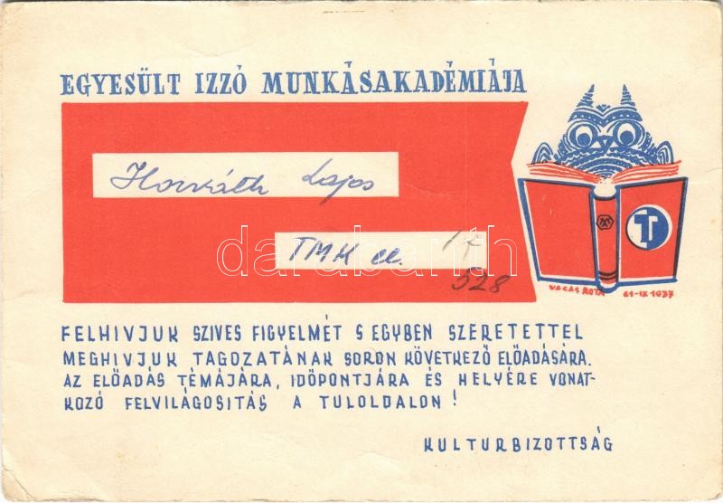 Leírás: 1937 Egyesült Izzó Munkásakadémiája meghívó s: Vasas Rota (EK)