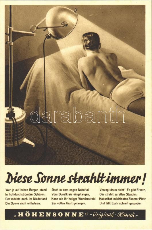 ~1950 Eredeti Hanaui Ultraviolett Napfénylámpa / Diese Sonne strahlt i... https://www.darabanth.com/hu/402-Gyorsarveres/402.0/Kepeslapok/Reklam~1000093/7E1950-Eredeti-Hanaui-Ultraviolett-Napfenylampa-Diese-Sonne-strahlt-immer-Hohensonne-Original-H~II2375372