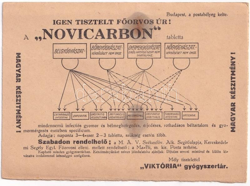 Leírás: Novicarbon reklámja. Rácz és Dr. Willmann "Viktória" Gyógyszertára. Budapest VII. Erzsébet körút 21. / Hungarian medicine advertisement (fl)