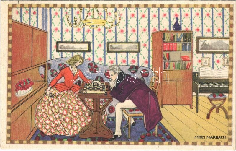 1917 Romantic couple playing chess. B.K.W.I. 670-6. s: Mitzi Marbach (... https://www.darabanth.com/hu/402-Gyorsarveres/402.0/Kepeslapok/Sakk~1000095/1917-Romantic-couple-playing-chess-BKWI-670-6-s-Mitzi-Marbach-fa~II2473387