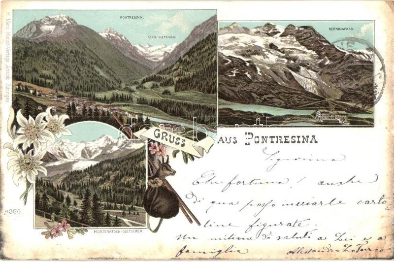 Leírás: 1897 Pontresina, Roseg-Gletscher, Berninapass, Morteratsch-Gletscher. H. Metz Kunst-Verlags 4396. floral. litho (EK)