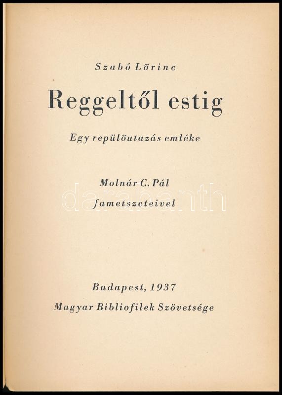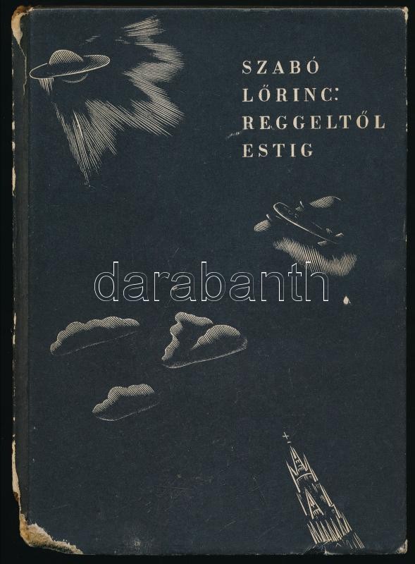 Szabó Lőrinc: Reggeltől estig. Egy repülőutazás emléke. Molnár C. Pál fametszeteivel. Bp.,1937, Magyar Bibliofilek Szövetsége, (Gyoma Kner Izidor-ny.) Első kiadás. Kiadói illusztrált kartonált papírkötés, Kner Erzsébet-kötés, kopott borítóval, sérült gerinccel.