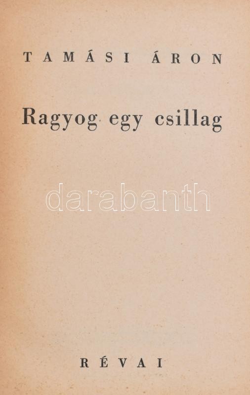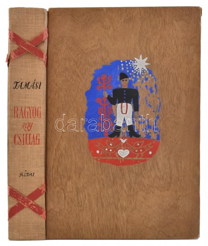 Tamási Áron: Ragyog egy csillag. A tábla rajzát Fenyves Sándor tervezte. Bp.,1938, Révai, 268 p. A tábla rajzát Fenyves Sándor (1907-1944) grafikus, illusztrátor, festő tervezte. Kiadói festett, fatáblás-kötésben, a borítón kopásnyomokkal, a gerincen a "szalagok" kopottak, szakadtak.