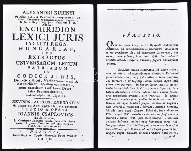 [[Kubinyi Sándor] Alexandrus Kubinyi: Enchiridion Lexici Juris Incliti Regni Hungariae, seu extractus universarum legum patriarum, in codice juris, ... Revisus, auctus, emendatus & usque ad Anni 1808. Decreta extensus studio & opera Joannis Csaplovics de Jeszenova. ...] Posonii [Pozsony], 1810., Sumtibus & Typis Simonis Petri Weber, 783 p. Latin nyelven. Félvászon-kötés, kopott borítóval, a címlap és egy lap fénymásolattal pótolt, néhány lapon ceruzás bejelöléssel, egy-két foltos lappal, ex libris-szel.