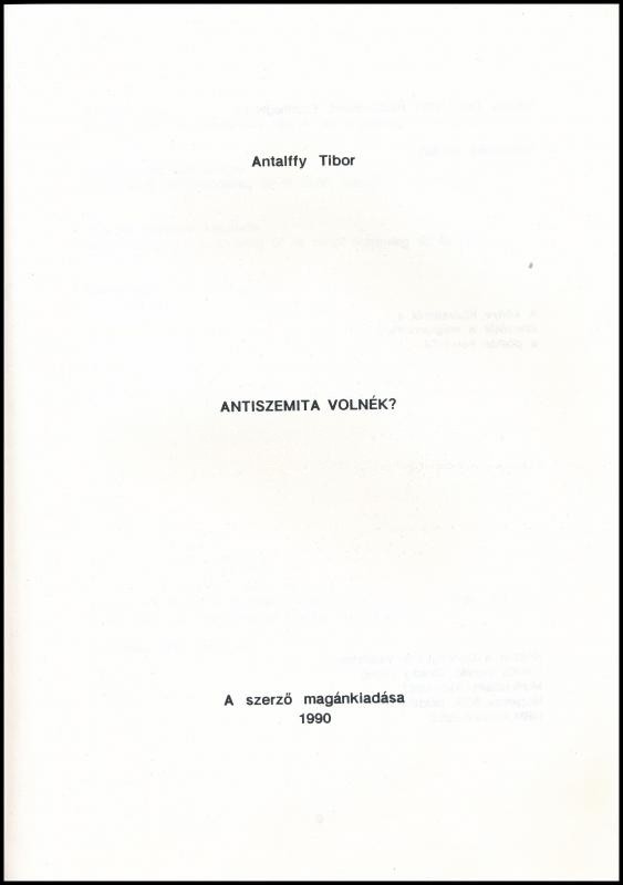 Leírás: Antalffy Tibor: Antiszemita volnék? H.n., 1990, szerzői magánkiadás. 113 p. Kiadói papírkötés. A 40-113. oldalak fordított sorrendben bekötve.