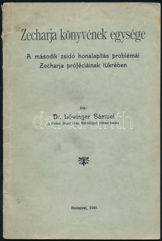 A második zsidó honalapítás problémái Zecharja próféciáinak tükrében. Bp. 1941. (Szerző.) 52 l. 1 sztl. lev. Tűzve, kissé sérült kiadói borítóban.
