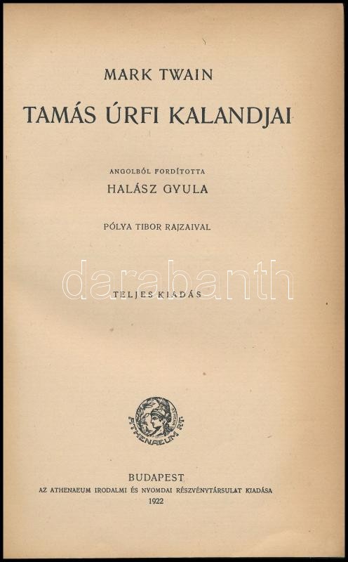 Mark Twain: Tamás úrfi kalandjai. Ford.: Halász Gyula. Pólya Tibor raj... https://www.darabanth.com/hu/402-Gyorsarveres/402.0/Konyvek/Konyvek-Mesekonyvek-ifjusagi-irodalom~1500018/Mark-Twain-Tamas-urfi-kalandjai-Ford-Halasz-Gyula-Polya-Tibor-rajzaival-Bp-1922-Pallas~II2473348
