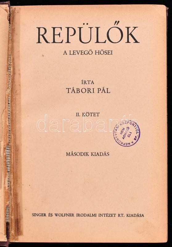 Tábori Pál: Repülők. A levegő hősei. I-II. kötet. A magyar irodalom jelesei. Bp.,é.n., Singer és Wolfner, (Bíró Miklós-ny.), 1 t. + 122+1 p.+ 8 (fekete-fehér képtáblák) t. +2+123-249+1 p.+8 (fekete-fehér képtáblák) t. + 1 (kihajtható térkép) t. Második kiadás. Fekete-fehér fotókkal illusztrálva, térképpel. Kiadói kopott egészvászon-kötés.