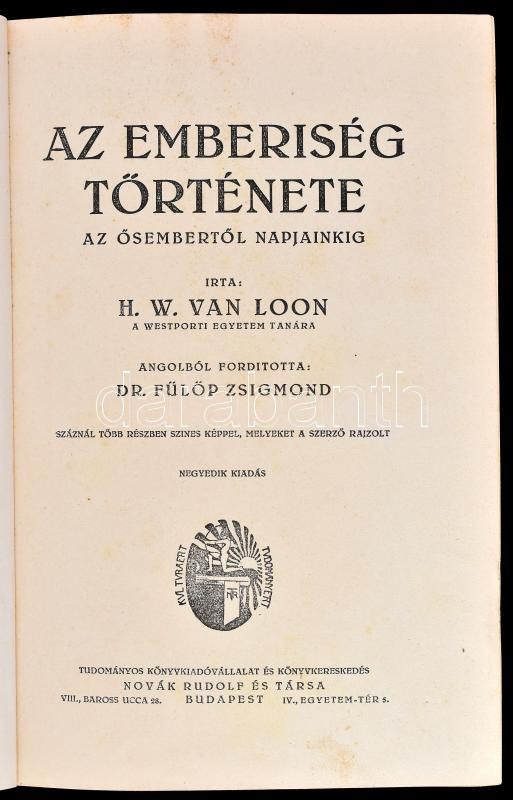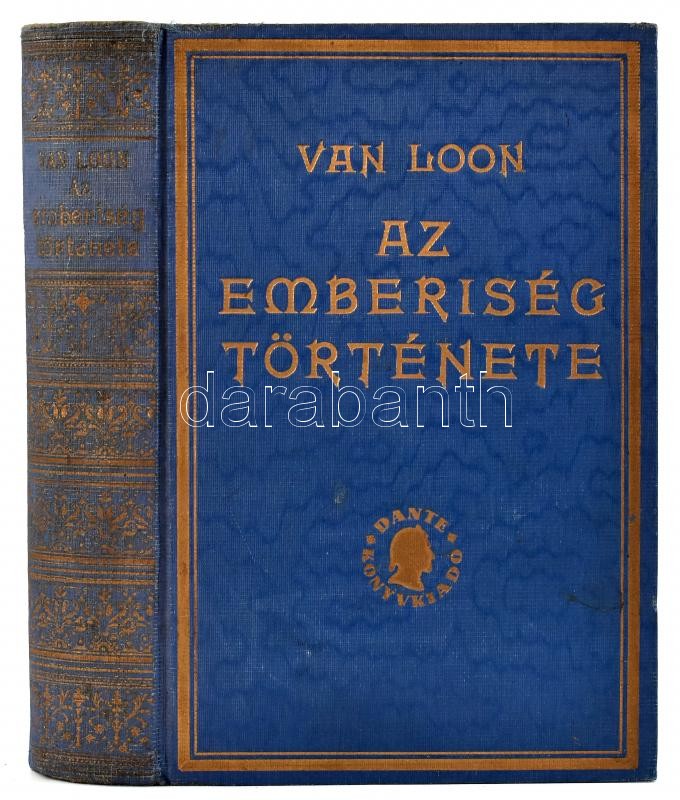 H. W. Van Loon: Az emberiség története. Az ősembertől napjainkig. Ford.: Dr. Fülöp Zsigmond. Bp., 1927, Dante. 1 t + 472+8 p. Negyedik kiadás. Számos fekete-fehér illusztrációval. Kiadói aranyozott, dombornyomott egészvászon-kötés, kissé sérült, kopott gerinccel, helyenként kissé foltos lapokkal.
