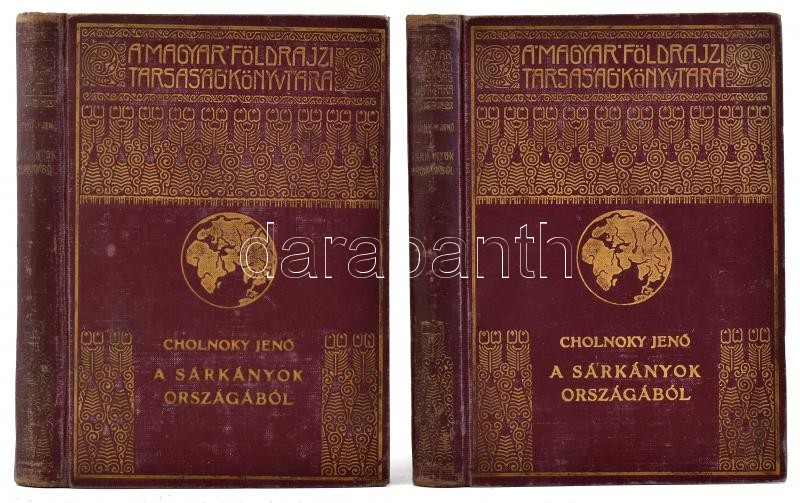 Cholnoky Jenő: A sárkányok országából. I-II. kötet. Magyar Földrajzi Társaság Könyvtára. Bp., [1935.], Franklin-Társulat. Szövegközi és egészoldalas fekete-fehér illusztrációkkal, kihajtható térképmelléklettel. Kiadói aranyozott, dombornyomott egészvászon-kötés, kopott borítóval és gerinccel, helyenként kissé foltos lapokkal, intézményi bélyegzőkkel, volt könyvtári példányok.