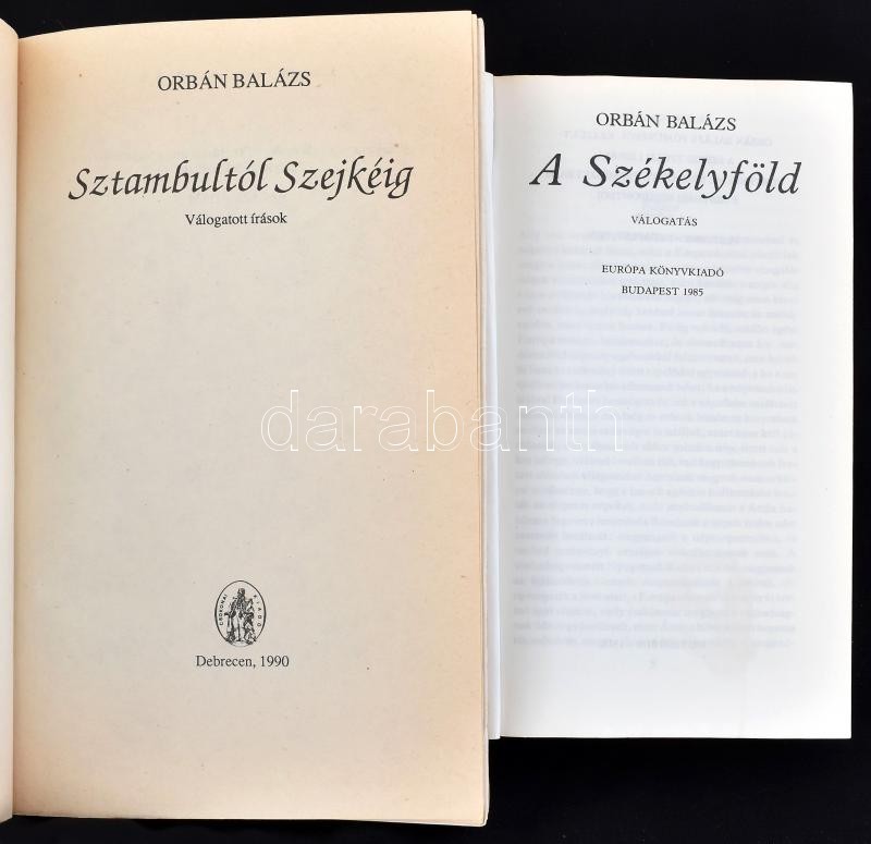 Leírás: Orbán Balázs: A Székelyföld. Válogatás. Szerk.: Katona Tamás. Bp., 1985, Európa. 560 p. Fekete-fehér képekkel illusztrálva. Kiadói papírkötés, tűrődött fóliázással, két lap foltos. + Orbán Balázs: Sztambultól Szejkéig. Válogatott írások. Szerk.: Balázs Ádám. Debrecen, 1990, Csokonai. 263 p. Fekete-fehér képekkel illusztrálva. Kiadói papírkötés, tűrődött fóliázással.