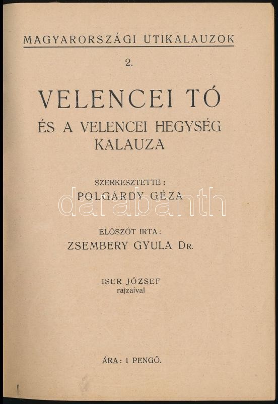 Velencei tó és a Velencei hegység kalauza. Szerk.: Polgárdy Géza. Magyarországi útikalauzok 2. Dr. Zsembery Gyula előszavával, Iser József rajzaival. Bp., 1938, "Élet" Irod. és Nyomda Rt. 56+2 p. Fekete-fehér képekkel illusztrált. Kiadói tűzött papírkötés. Kihajtható térképmelléklettel (Agárd, 1 : 25.000, M. Kir. Térképészeti Intézet).