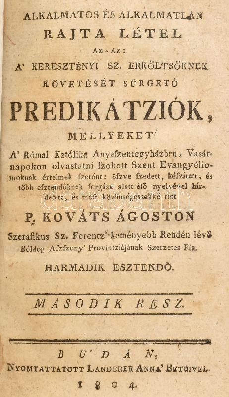 P. Kováts Ágoston: Alkalmatos és alkalmatlan rajta létel az-az: a' keresztényi sz. erköltsöknek követését sürgető prédikátziók, mellyeket A' Római Katólika Anyaszentegyházban, Vasárnapokon olvastatni szokott Szent Evangyéliomoknak értelmek szerént: öszve szedett, készített, és több esztendőknek forgása alatt élő nyelvével hírdetett, és most közönségessekké tett P. Kováts Ágoston. Harmadik esztendő. Második rész. Buda, 1804, Landerer Anna. 460+(12) p. Korabeli aranyozott, bordázott gerincű félbőr-kötés, festett lapélekkel, kissé sérült, kopott borítóval és gerinccel, kissé foltos lapokkal.