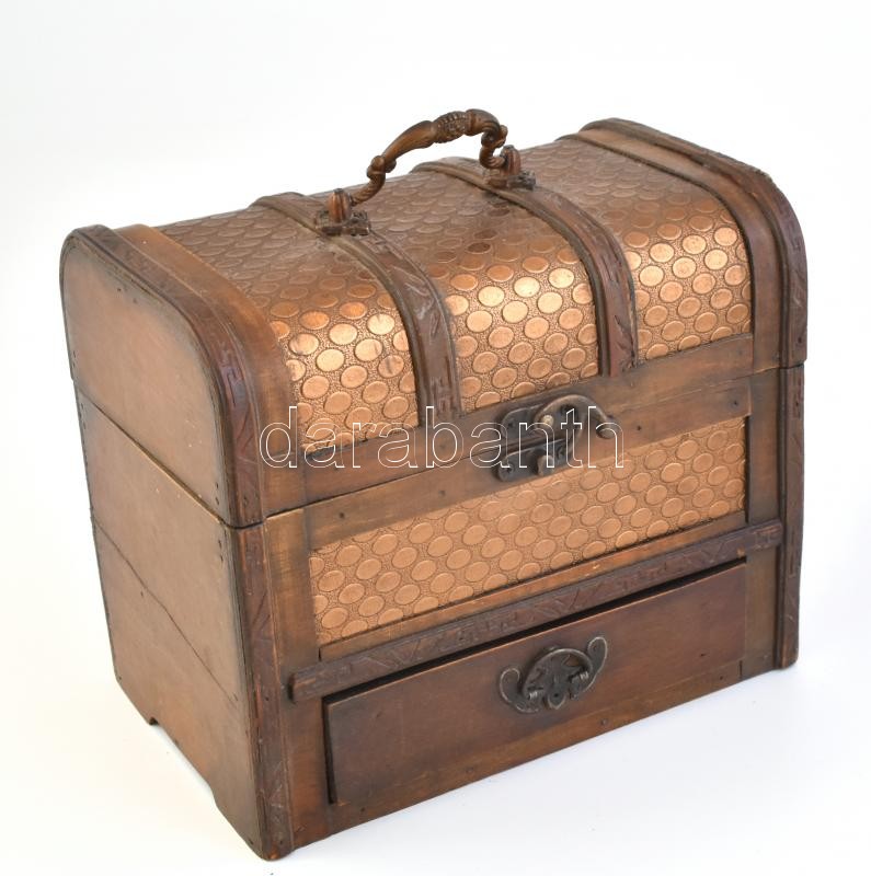 Leírás: Fiókos, nyitható tetejű fa tároló doboz, 22x14x18 cm