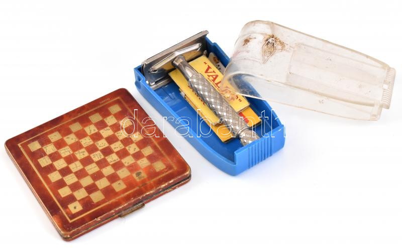 Leírás: Gillette fém borotva, pengékkel, sérült műanyag tokjában, h: 8 cm + zománcozott fém pudrié tükörrel, kopottas, használt állapotban, 7,5x7,5 cm