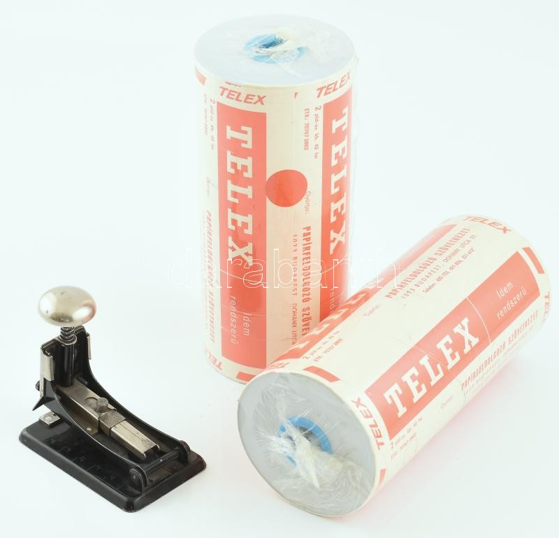 Leírás: Retró irodai kellékek, 3 db: Derby magyar gyártmányú fém tűzőgép, 10,5x6,5x10 cm + Telex Idem rendszerű papír, 2 bontatlan tekercs
