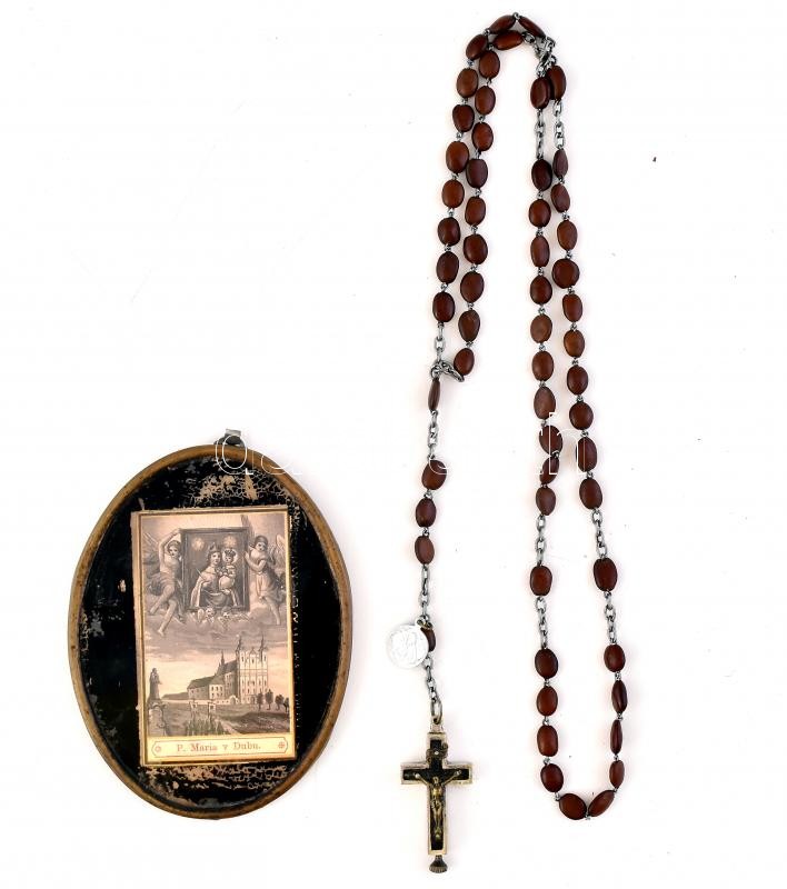 Leírás: Rózsafüzér ereklyetartó kereszttel + régi szentkép, kissé sérült ovális réz keretben, 11x8 cm
