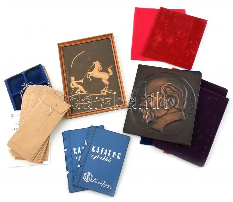 Tarasz Hrihorovics Sevcsenko (1814-1861) ukrán költő, író, festőt ábrázoló domborműves réz falikép, 28,5x25,5 cm + Lovat fékező csikós, szalmakép üvegezett fa keretben, külső méret: 32x23,5 cm + vegyes numizmatikai kellékek: éremtartó tálca, 15 db lezárható papírtok, MÉE árverési katalógus, stb.