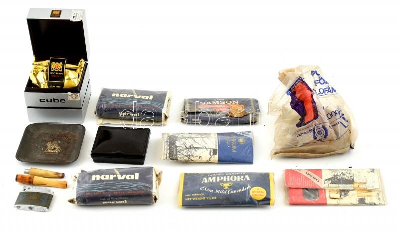 Vegyes dohányzó és pipadohány tétel (Mac Baren Tobbaco bontatlan dohány, 2 db sérült szipka, sérült öngyújtó, sérült Teván Margit hamutál, vegyes bontott pipadohányok)