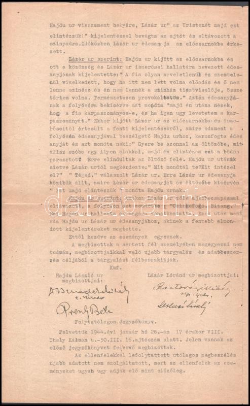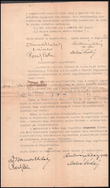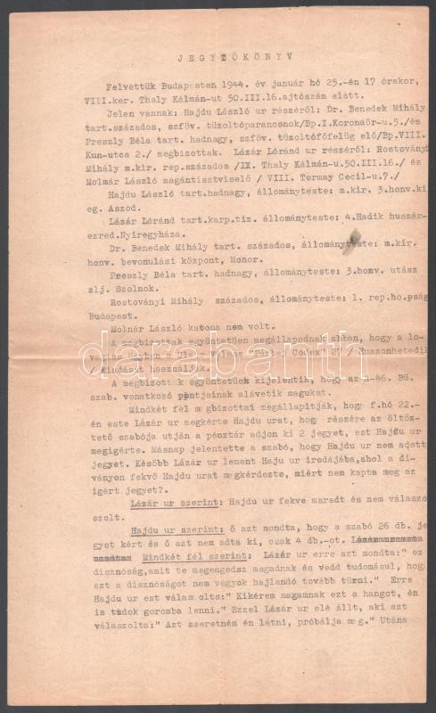 Leírás: 1944 Jegyzőkönyv katonai becsületbeli ügyről