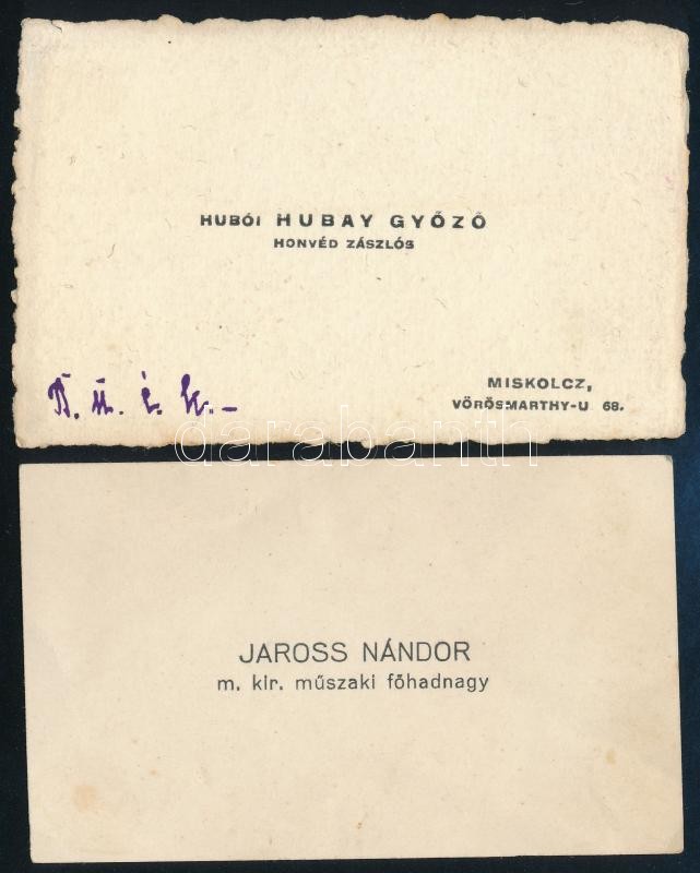 Leírás: Hubói Hubay Győző honvéd zászlós és Jaross Nándor m. kir. műszaki főhadnagy névkegykártyája, 2 db