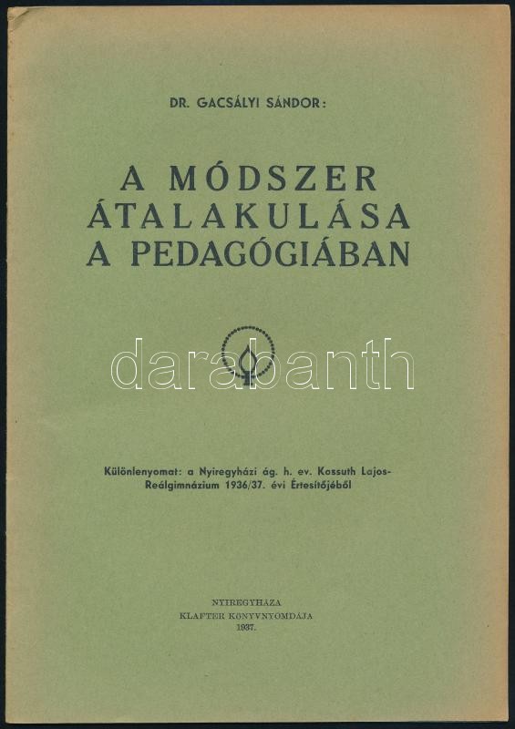 Leírás: Gácsályi Sándor: A módszer átalakulása pedagógiában. Dedikált. Nyíregyháza, 1937. 16p.