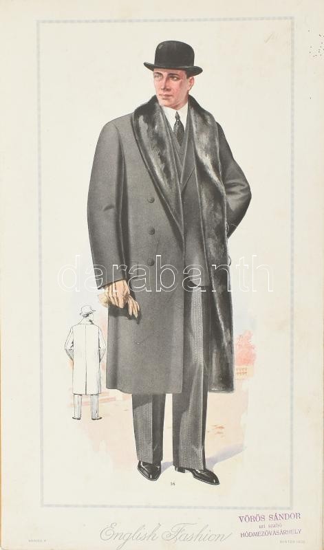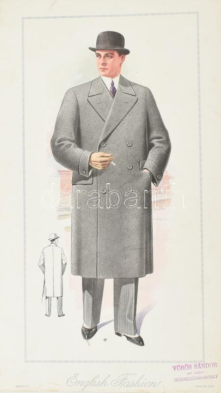 Leírás: cca 1930 English fashion - Angol divat. 13 nagyméretű táblát tartalmazó mappa. Vörös Sándor hódmezővásárhelyi szabó pecsétével. 44x24 cm