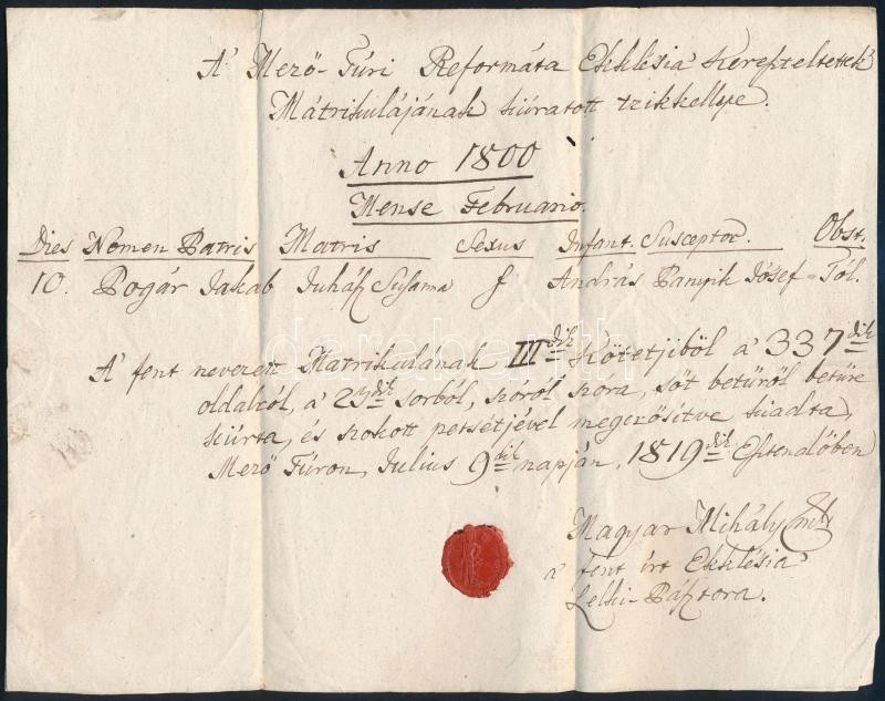 Leírás: 1819 Mezőtúr, kivonat a Református Eklézsia keresztelési anyakönyvéből, viaszpecséttel