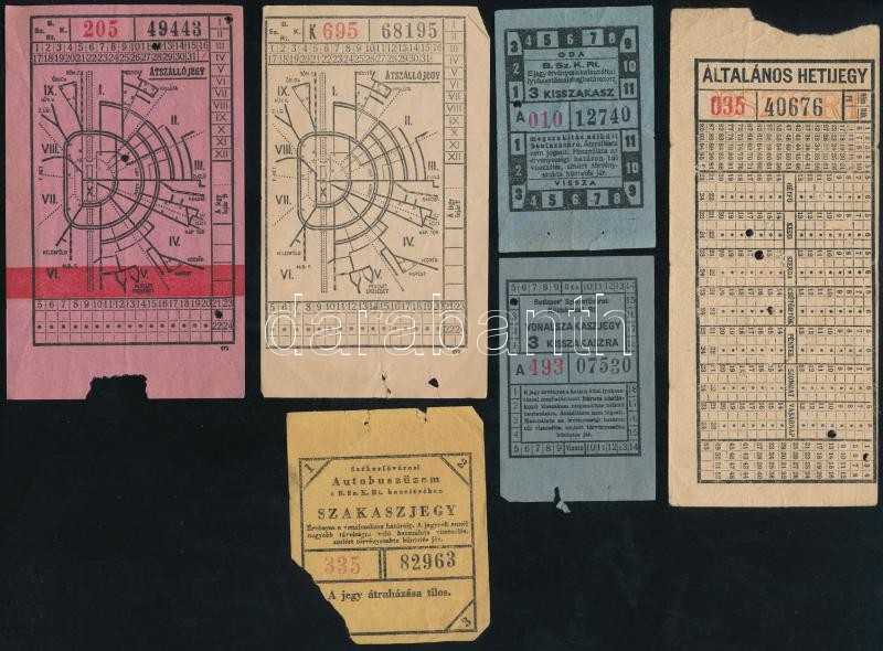 Budapesti közlekedési jegyek, autóbusz, villamos, 6 db. https://www.darabanth.com/hu/402-Gyorsarveres/402.0/Mutargy-papirregiseg-egyeb/Okmanyok~500018/Budapesti-kozlekedesi-jegyek-autobusz-villamos-6-db~II2471863