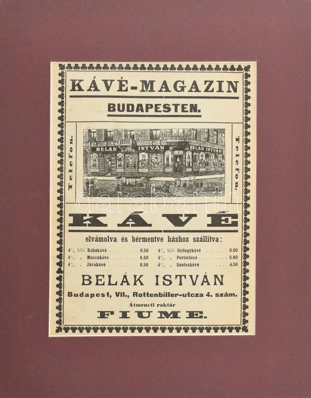 Leírás: cca 1900-1910 Kávé-magazin Budapesten, Rottenbiller u. 4., átmeneti raktár Fiume. Reklám nyomtatvány, papír, paszpartuban. 25x19 cm
