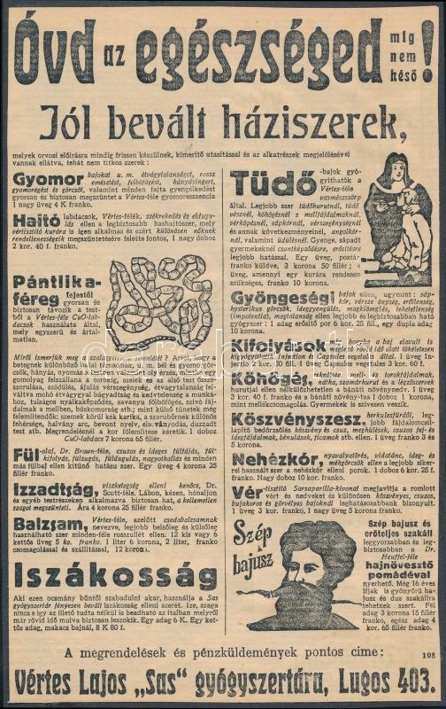 cca 1910 Védd az egészséged. Vértes Lajos, Lugosi gyógyszertára reklám... https://www.darabanth.com/hu/402-Gyorsarveres/402.0/Mutargy-papirregiseg-egyeb/Reklam~500022/cca-1910-Vedd-az-egeszseged-Vertes-Lajos-Lugosi-gyogyszertara-reklam-kartonon-22x13-cm~II2470192