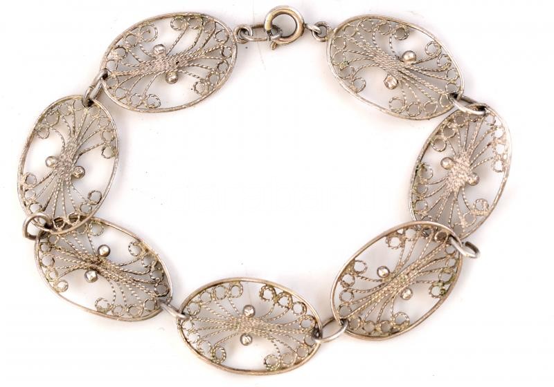 Leírás: Ezüst (Ag) filigrán karkötő, jelzés nélkül, helyenként kissé hajlott, h: 19 cm, nettó: 8,45 g