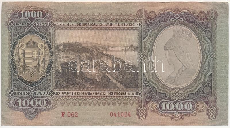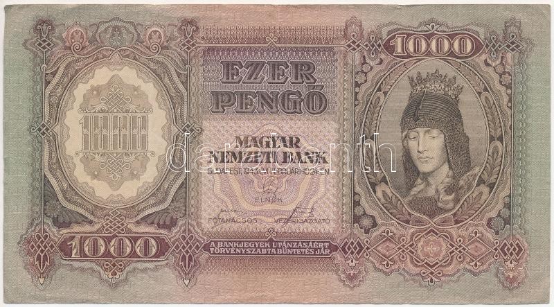 1943. 1000P "F 062 041024" T:III Adamo P21 https://www.darabanth.com/hu/402-Gyorsarveres/402.0/Numizmatika/Magyar-bankjegyek~2000007/1943-1000P-F-062-041024-TIII-Adamo-P21~II2472088