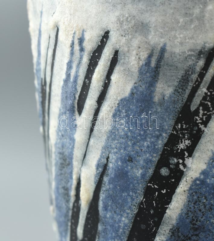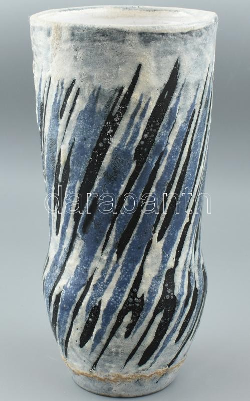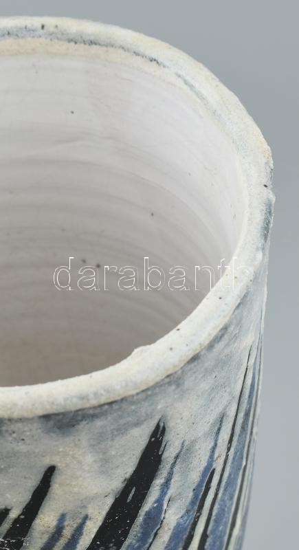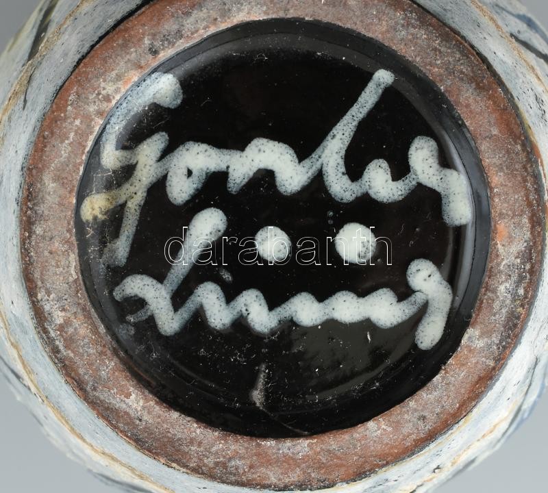 Gorka Lívia (1925 - 2011) Díszváza. Korongozott és kézzel formázott samottos kerámia. Oldalukon csavart mintázatú, többrétegű, fekete, kék és fehér mázakkal festett és visszakarcolt technikával díszített vázatest. Vízkőmaradványok. Alján jelzett: festett Gorka Lívia. m: 26cm