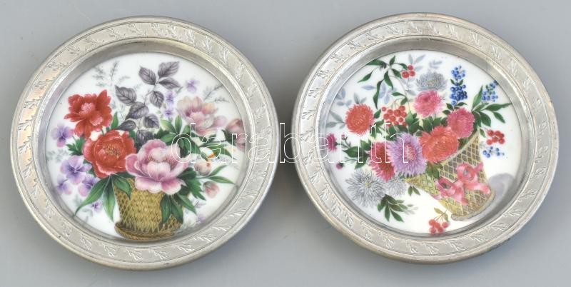 Leírás: 2 db falra akasztható dísztálka virágkosár díszítménnyel, matricás porcelán, alumínium foglalatban. d:10cm