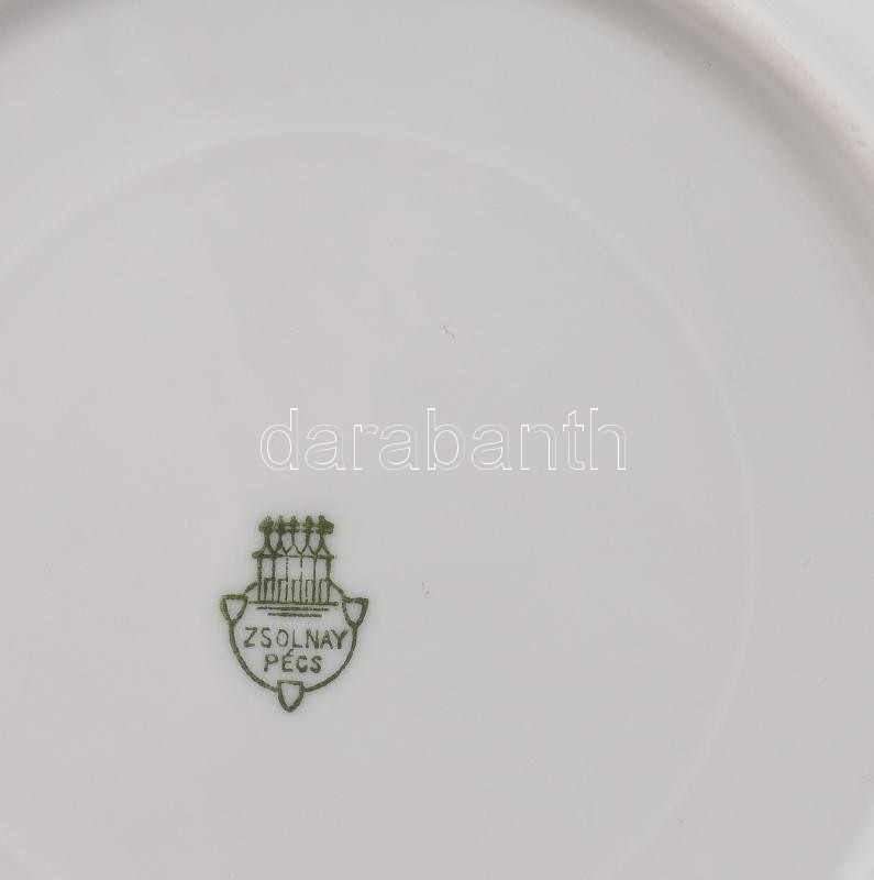 Leírás: Zsolnay mitológiai jelenettel díszített, irizáló porcelán teáscsészék aljjal, 5 db. Matricás, jelzett, kis kopásnyomokkal, az egyik aljon lepattanással