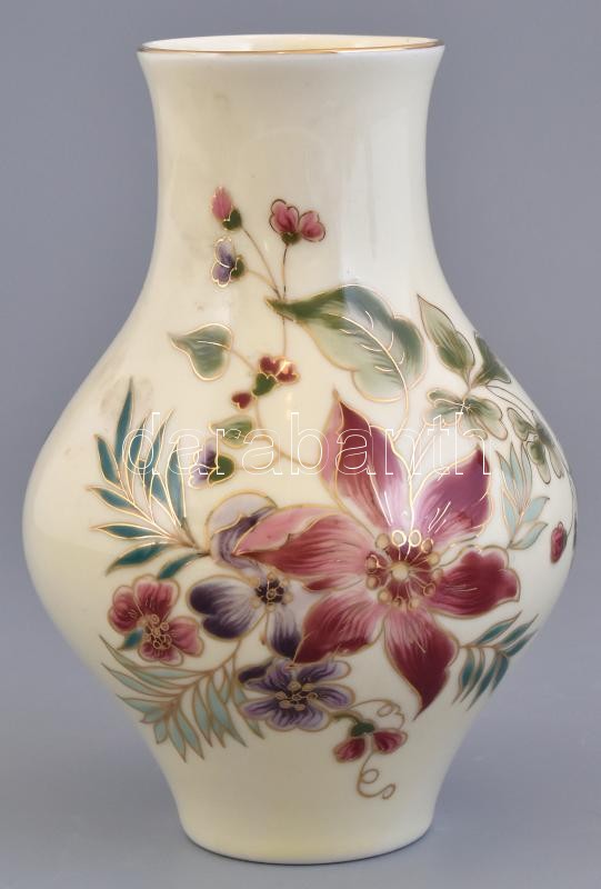 Leírás: Zsolnay porcelán váza virág mintával. Kézzel festett, jelzett, hibátlan. m: 18,5 cm