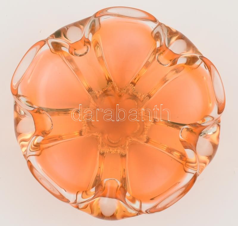 Leírás: Dekoratív barackszínű üveg kínáló, alján karcolásokkal, d: 20 cm, m: 7 cm