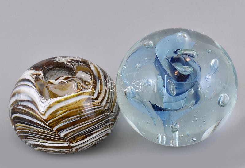Leírás: Gömb alakú üveg levélnehezék + gyertyatartó, 2 db, az egyik alján kis csorbával, kopásnyomokkal, m: 7,5 cm és 5 cm