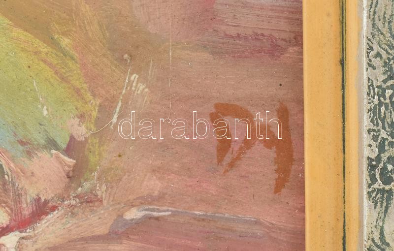 Leírás: DH jelzéssel: Színes kép. Olaj, papír. Hátoldalán Dési Huber István nevével feliratozott. Kissé sérült keretben. 52,5x34,5 cm