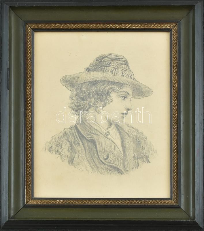 Leírás: Jelzés nélkül: Fiú porté. Ceruza, papír. Üvegezett keretben. 23x18 cm