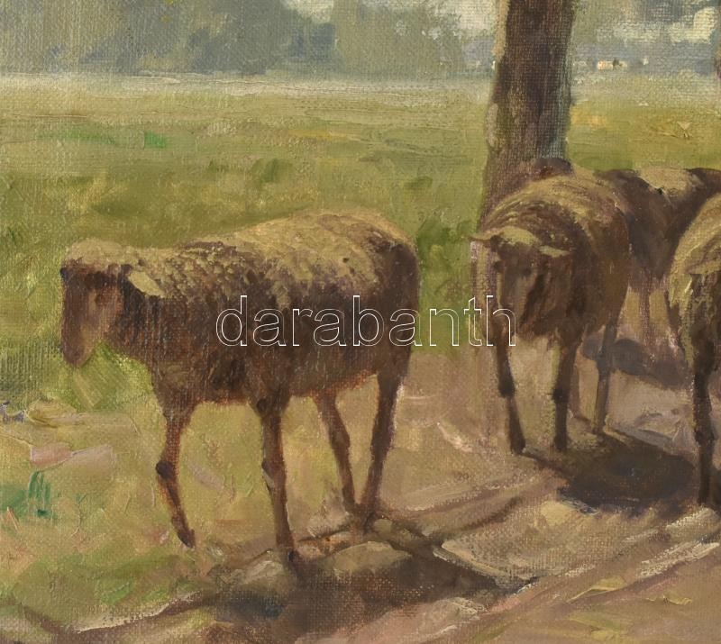 Leírás: Liptai A. jelzéssel: Birkanyáj. XX. század első fele. Olaj, vászon, szép dekoratív keretben. 60x70 cm