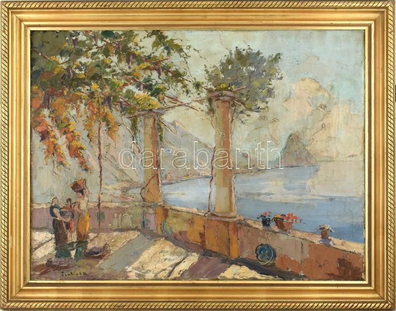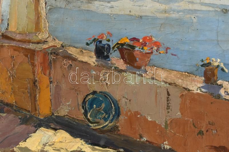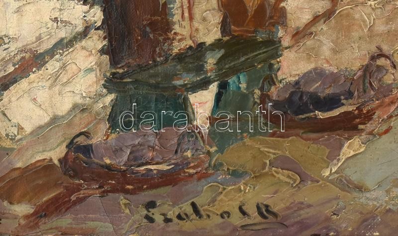 Leírás: Olvashatatlan (Szabó?) jelzéssel: Napfényes vízparton. Olaj, vászon. Hátoldalán Képcsarnok Vállalat hiányos címkéjével. Dekoratív fa keretben, 60x79,5 cm